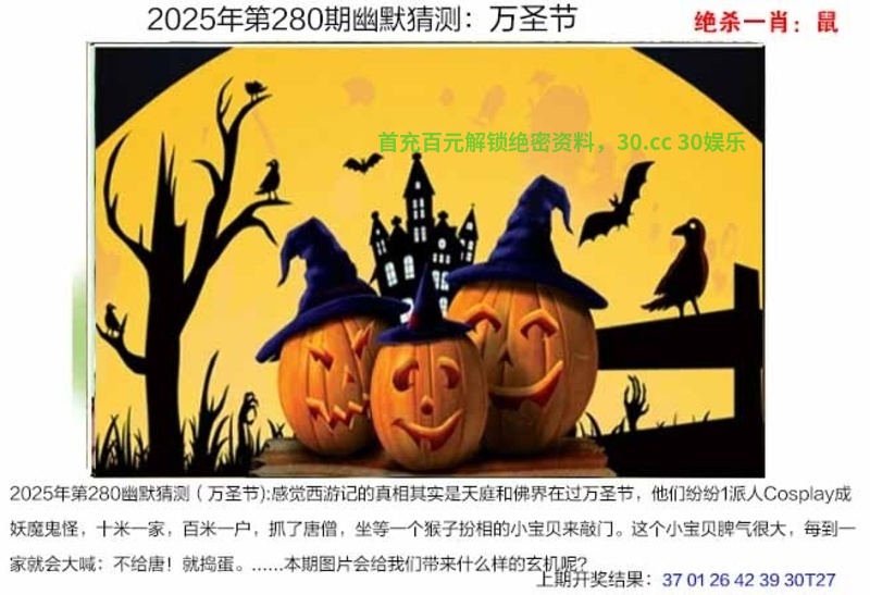 280期图片猜测(万圣节)【开:發00】 感觉西游记的真相其实是天庭和佛界在过万圣节,他们纷纷1派人Cosplay成妖魔鬼怪,十米一家,百米一户,抓了唐僧,坐等一个猴子扮相的小宝贝来敲门。这个小宝贝脾气很大,每到一家就会大喊:不给唐!就捣蛋。..本期图片会给我们带来什么样的玄机呢? 解:西游记解出西肖狗马虎幽默猜测推荐六肖:兔狗虎鸡马蛇本期猜测看好十码:27.39.20.44.16.40.33.45.12.37点击注册30.cc娱乐3090.com大额无忧 |